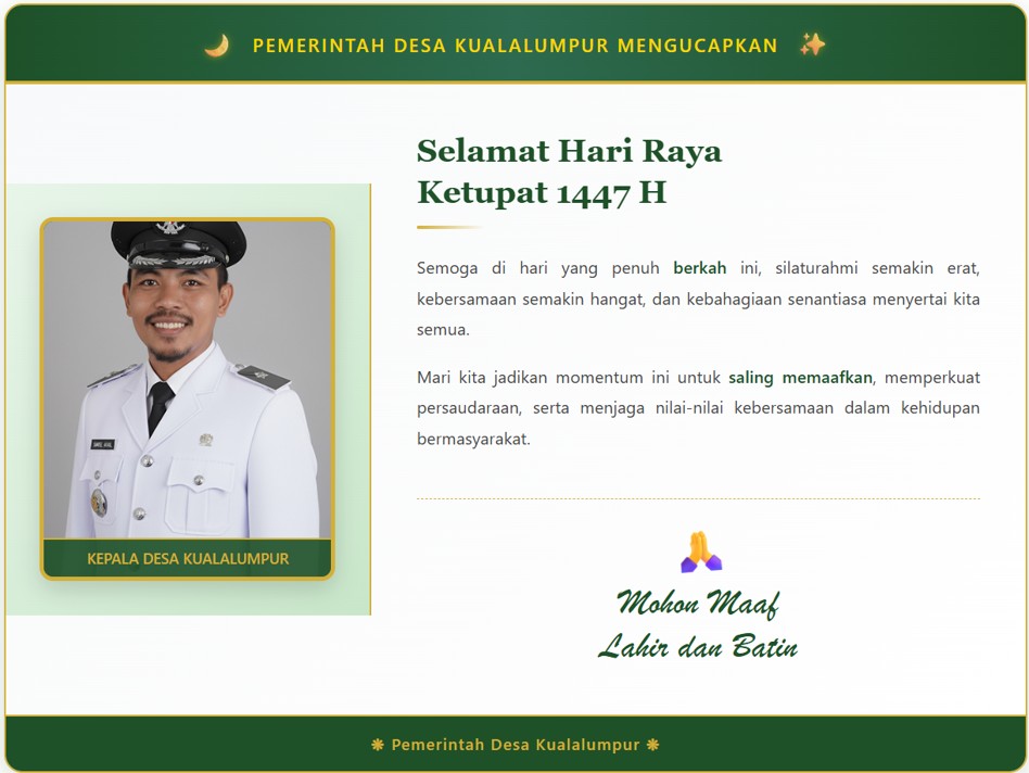 “Website resmi Desa Kualalumpur, menyajikan informasi, pengumuman, program, dan kegiatan desa untuk masyarakat dan publik.”